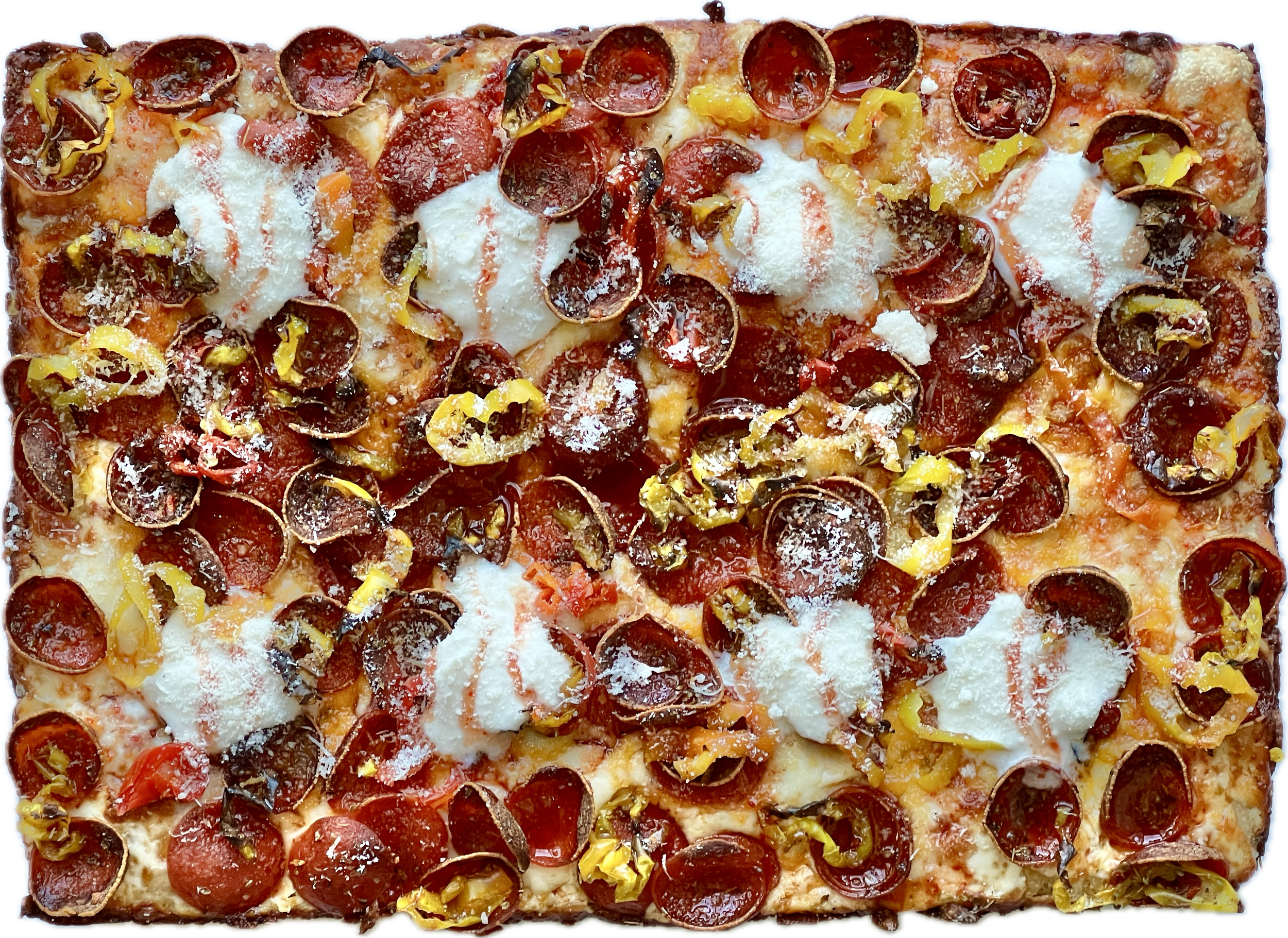 Uncle Rico Ezzo pepperoni, banana peppers, whipped garlic ricotta, Calabrian chilli honey, grana padano, brick/mozzarella blend, OG tomato sauce